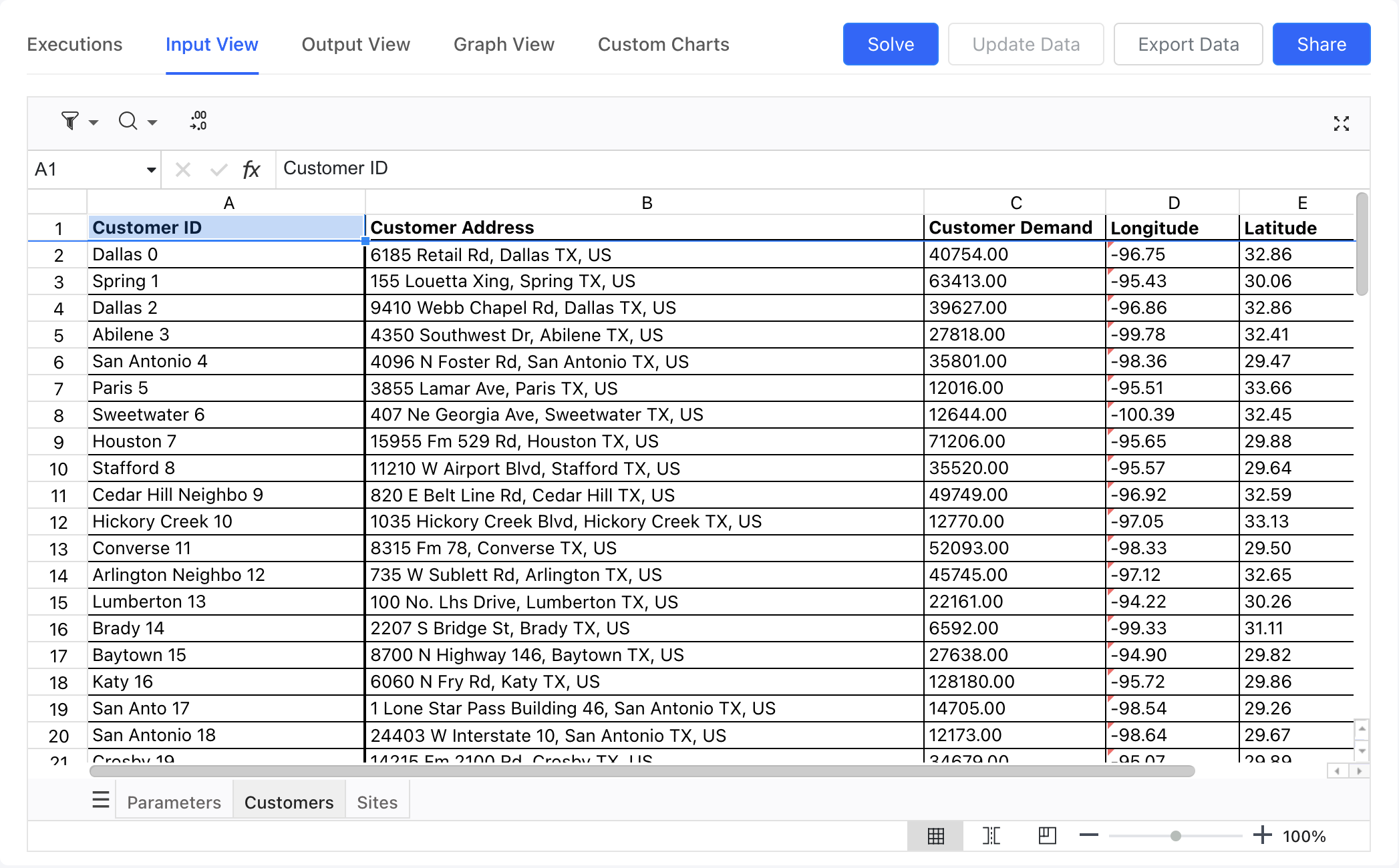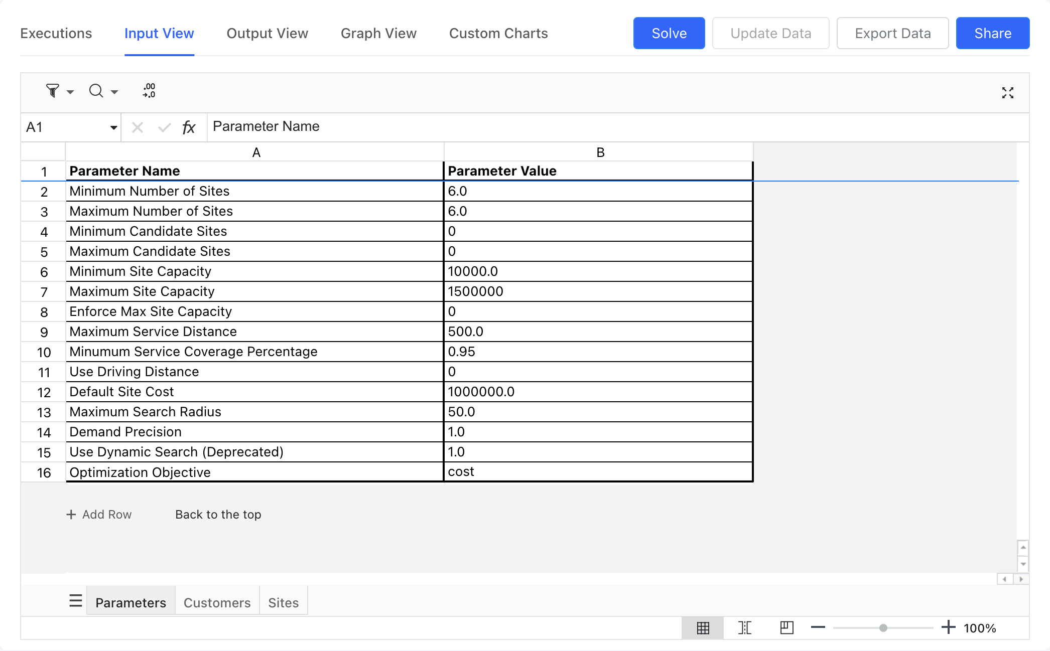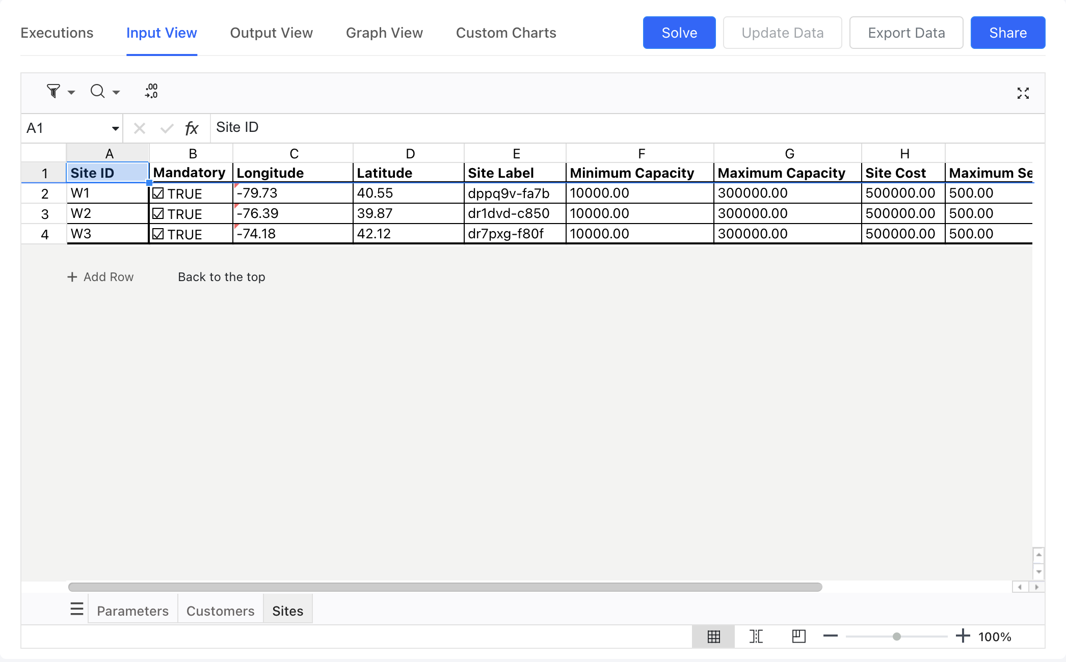 - Make Informed Edits: When updating values, ensure that the changes are consistent with your overall optimization goals. For example, adjusting customer demand or site capacities will directly impact the results.