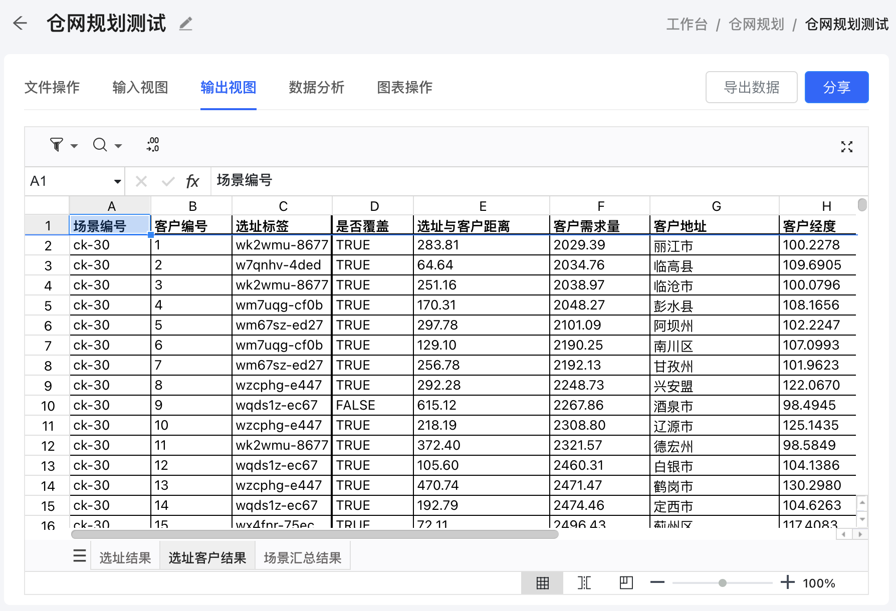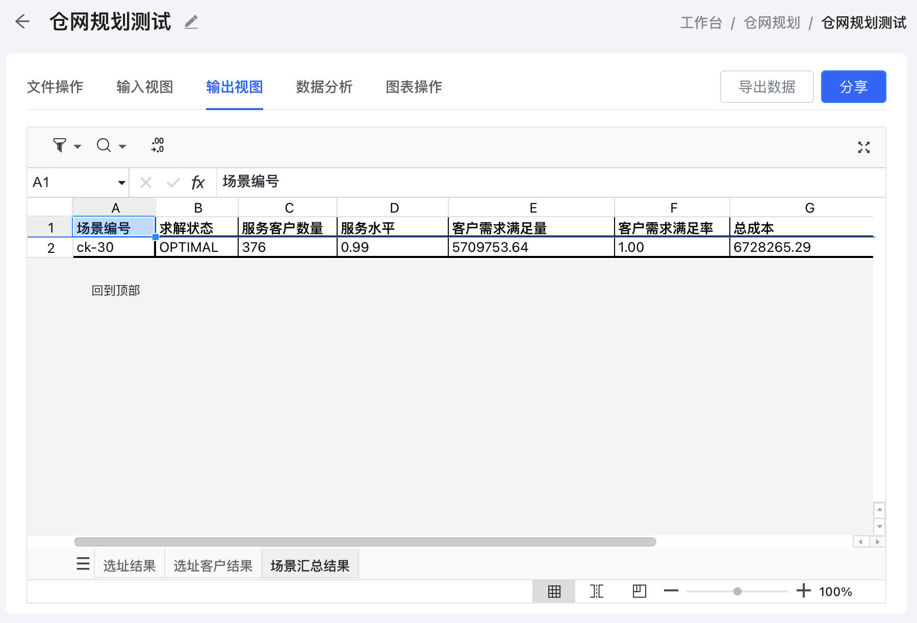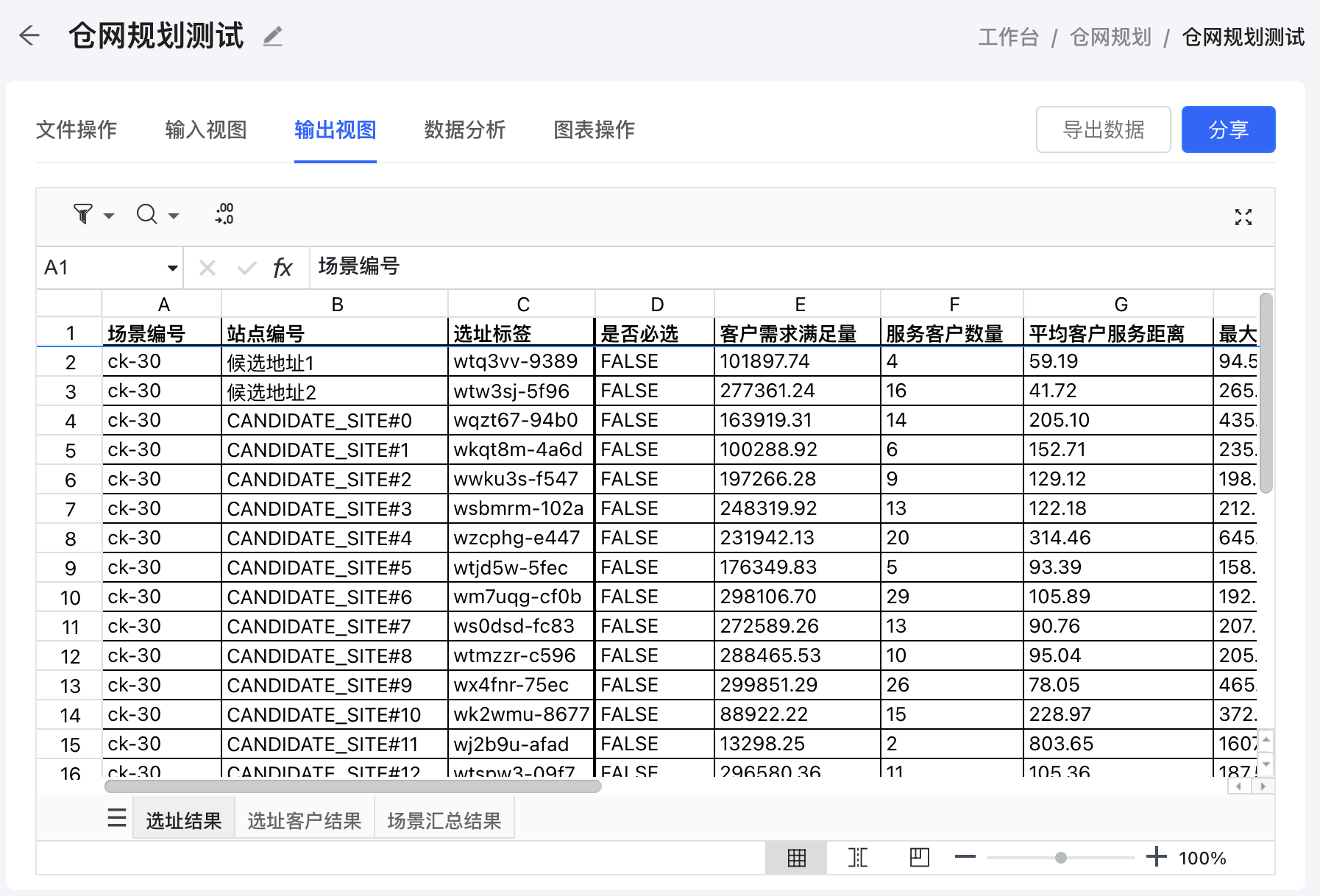 The Output View page in the Network Design tool provides a detailed overview of the results generated by the optimization process. This section will guide you through the various tables/sheets included in the output and explain the key columns within each sheet. Additionally, you'll learn how to export the output data into an Excel file for further analysis or reporting.