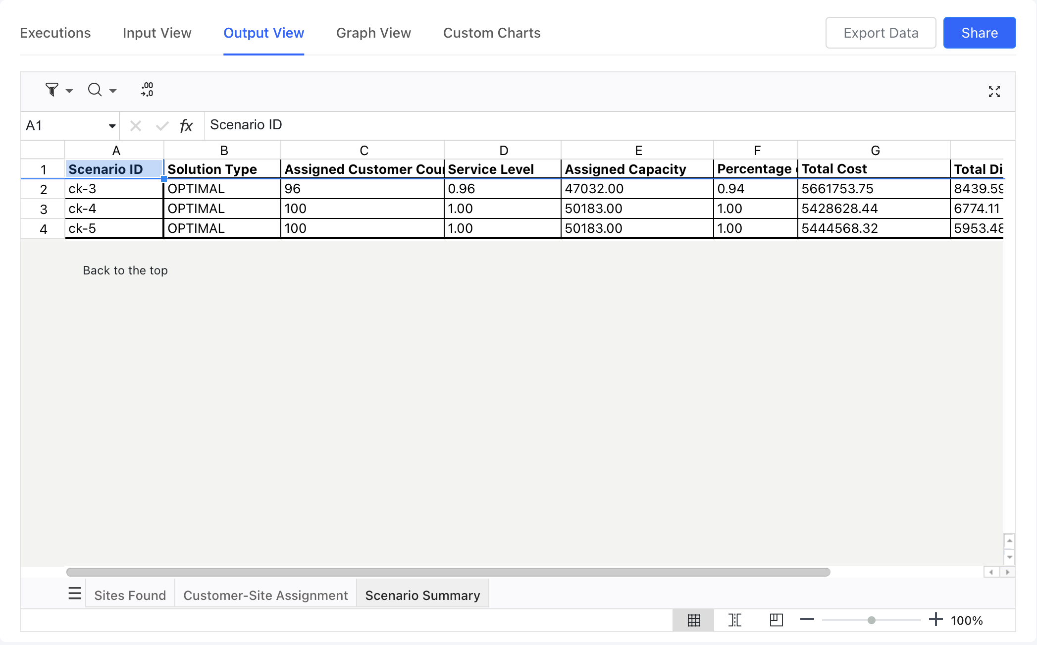 - Scenario ID: The ID representing the scenario. It has a prefix "ck-" followed by a number. The number indicates the total number of sites included in the solution for that scenario.